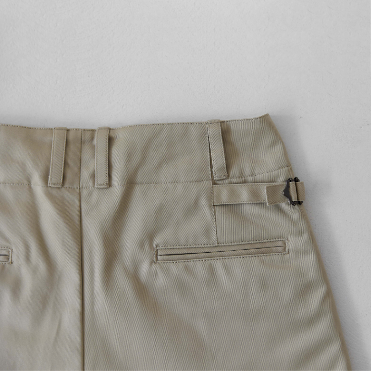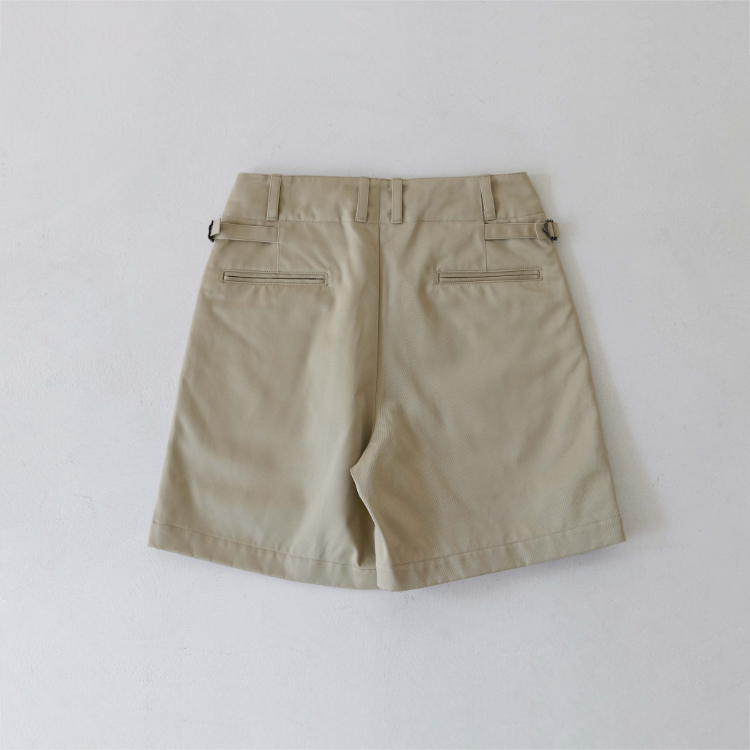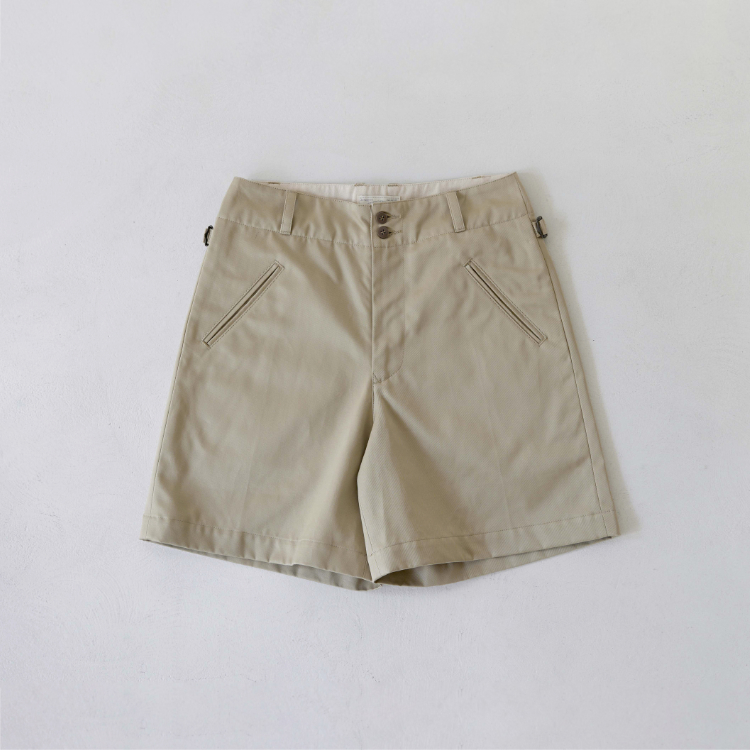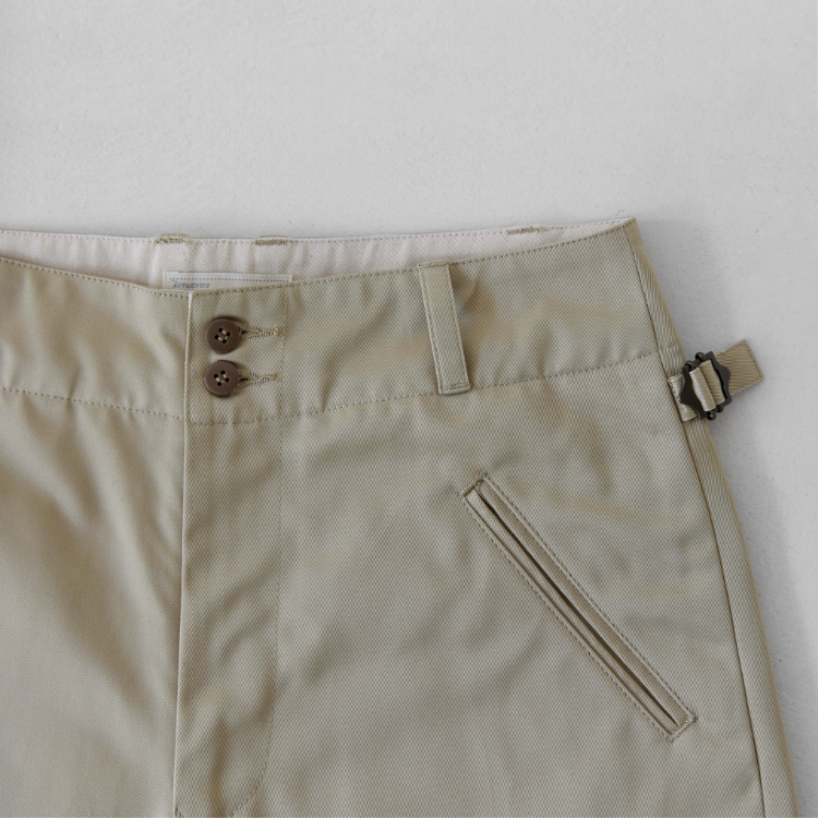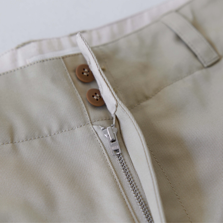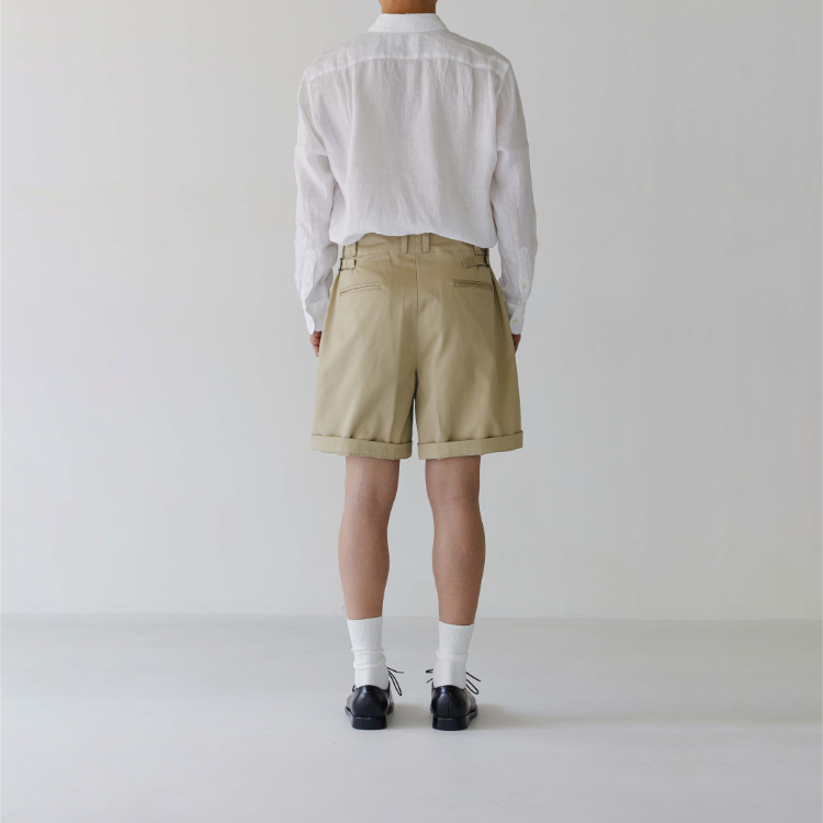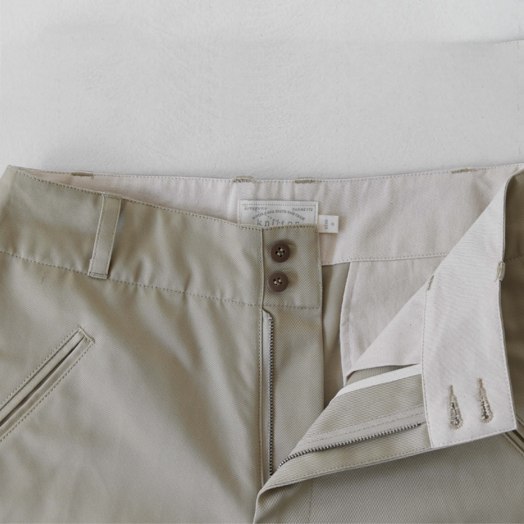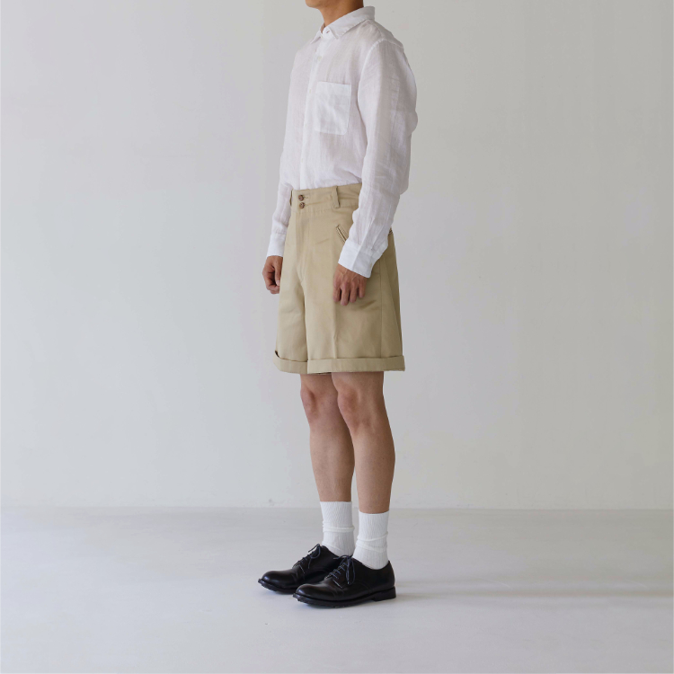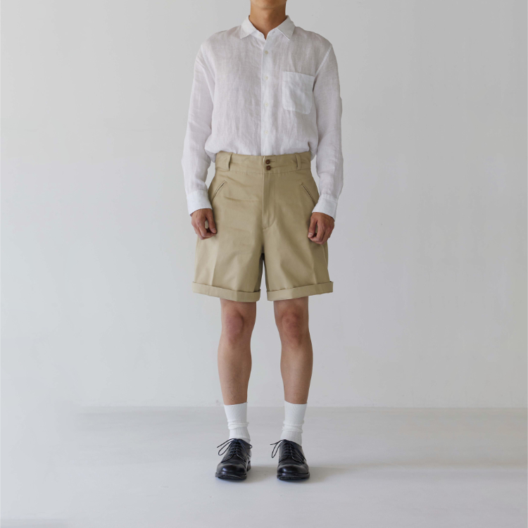 [105-001] 치노 쇼츠 생산 시 사용된 원단은 일본에서 오랜 시간 꾸준하게 사용돼 온 CM36/2 x CM24/2의 원단입니다. CM20 x CD16의 전형적인 치노 원단의 사양에 비해 더 가늘고 부드러운 실 2개를 엮어 더 밀도있고 탄탄하게 짜냈습니다. 그런 이유 때문인지 은은한 원단 표면의 광택이 좋은 원단입니다.