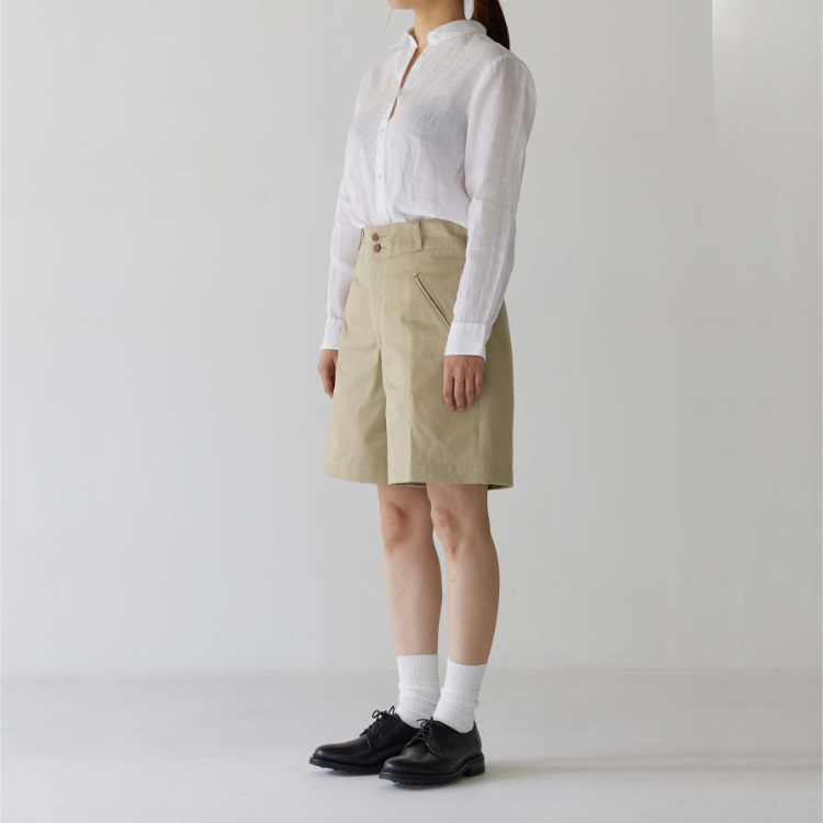[105-001] 치노 쇼츠 생산 시 사용된 원단은 일본에서 오랜 시간 꾸준하게 사용돼 온 CM36/2 x CM24/2의 원단입니다. CM20 x CD16의 전형적인 치노 원단의 사양에 비해 더 가늘고 부드러운 실 2개를 엮어 더 밀도있고 탄탄하게 짜냈습니다. 그런 이유 때문인지 은은한 원단 표면의 광택이 좋은 원단입니다.